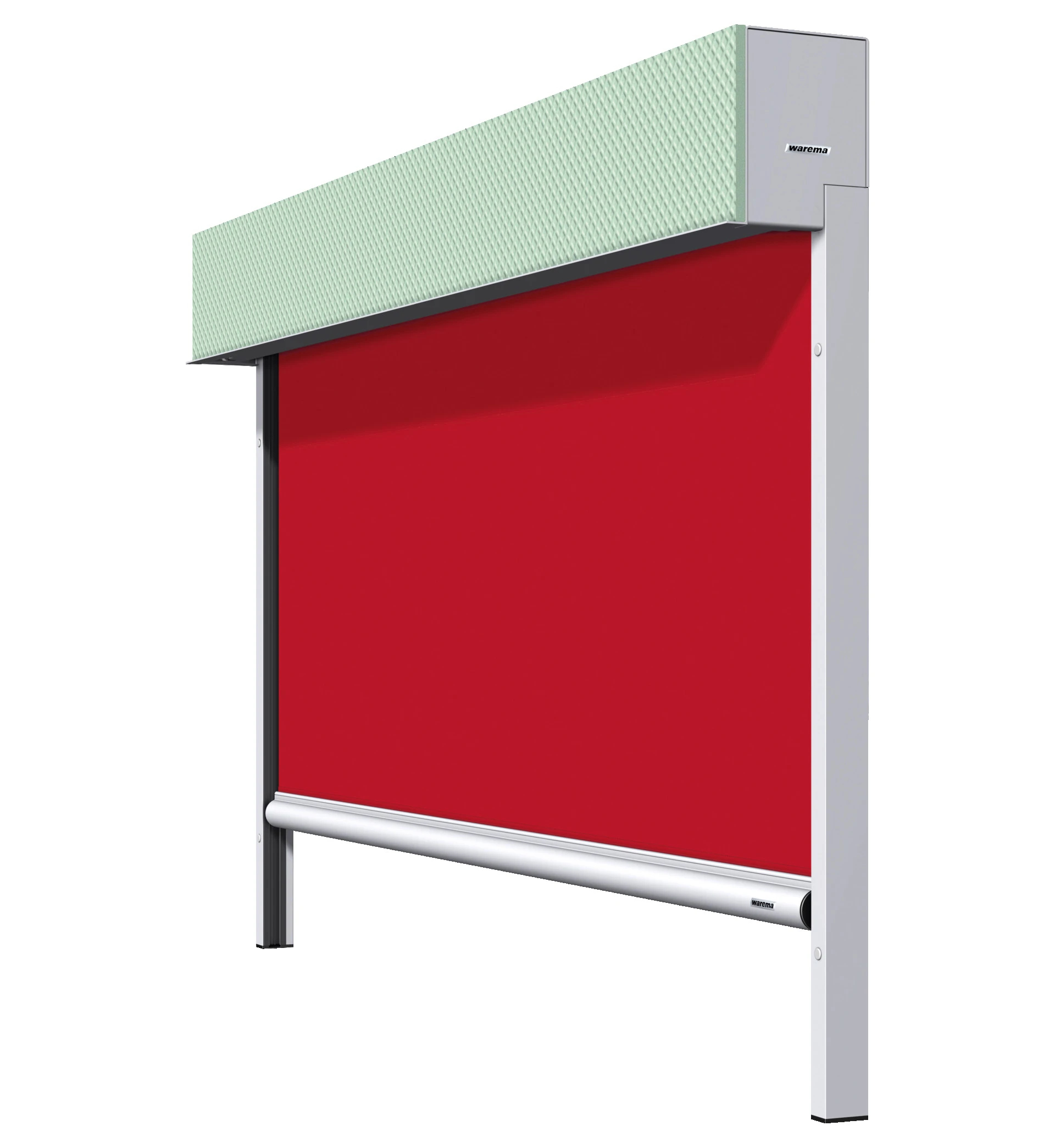 Markise in Rot mit grünem verputzbaren Kasten und easyZIP-Führung