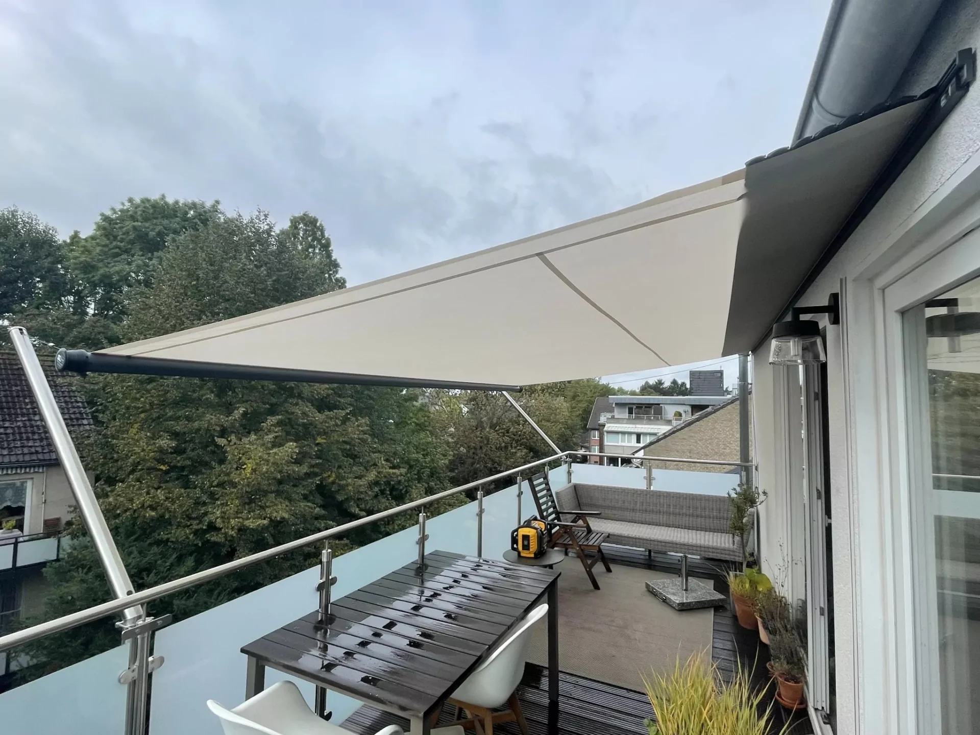 Die entsprechende Sensorik sorgt auch bei unvorhergesehenen Wetterlagen wie starkem Wind für ein automatisches Einfahren des Sonnensegels. So wird das Segel zuverlässig vor Schäden geschützt.